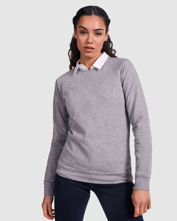 Felpa a maniche lunghe in cotone stile raglan. Con colletto, polsini e girovita, in costina 2x1. Girocollo con copri cuciture di rinforzo all'interno del colletto. Dettaglio frontale con cuciture incrociate, in tessuto a costine 2x1.