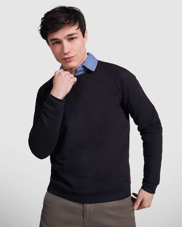 Felpa a maniche lunghe in cotone stile raglan. Con colletto, polsini e girovita, in costina 1x1.Girocollo con cuciture di decorazione incrociate e copri cuciture di rinforzo all'interno del collo.