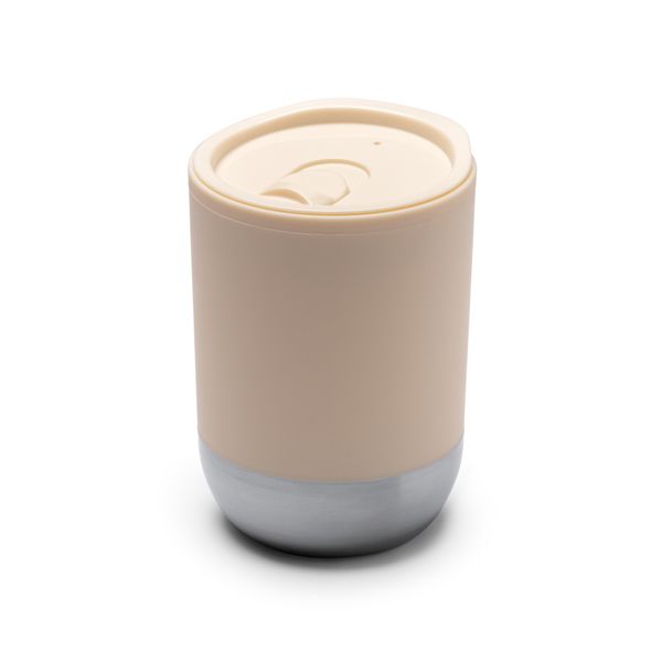 Tazza a doppia parete con corpo in PP riciclato e base in acciaio inox 304. Include un coperchio di misurazione. Capacità: 290 ml Confezione in design ecologico.