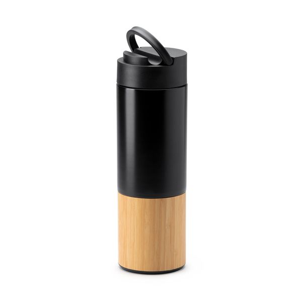 Porta pranzo con posate e bottiglia. Porta pranzo in acciaio inox 304, capacità 800 ml e coperchio in bambù con fascia elastica di sicurezza. Include set di posate in bambù. Bottiglia in acciaio inox 304, capacità 500 ml. Confezione in scatola ecologica.