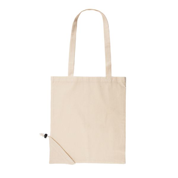 Borsa della spesa pieghevole 100% cotone 105gr/m2. Con manici lunghi 70cm e cordoncino pieghevole regolabile.