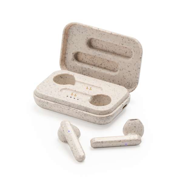 Cuffie wireless Bluetooth 5.0 in fibra di grano con custodia di ricarica. Pannello di controllo con tecnologia touch integrata nelle cuffie. Funzione vivavoce. Custodia per batteria ricaricabile con coperchio magnetico. Cavo di ricarica incluso.