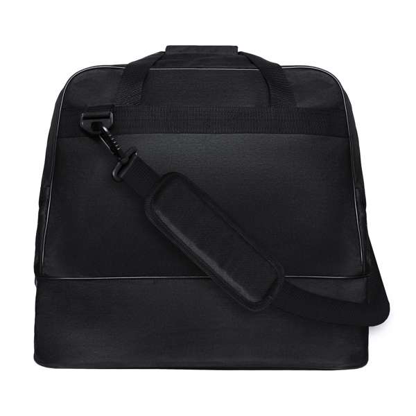 Borsa sportiva con doppio manico e lunga tracolla regolabile. Tasca principale con doppio zip. Tasca per le scarpe con scomparto rimovibile. Anti-umidità. Base con borchie. Facile da pulire. 53 L.
