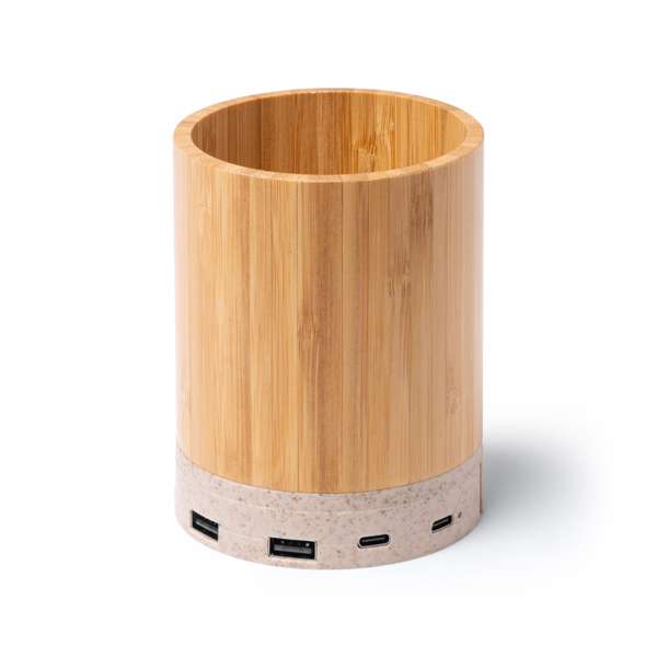 Portamatite con struttura principale in bambù e base con funzione di caricabatterie wireless in fibra di grano. Uscita da 15W. Porta USB integrata nella base con due porte di tipo C e due uscite USB. Confezione in scatola di design ecologico.