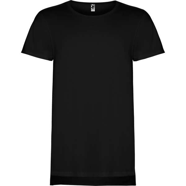 T-shirt manica corta, taglio extra lungo, girocollo a due strati con elastane. Spacchetti laterali nel girovita. Il taglio della schiena è leggermente più lungo di quello anterioire.