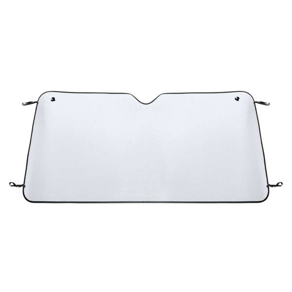 Grande parasole ideale per camion e furgoni. Bolla bifacciale, in alluminio con finitura metallica e finiture nere. Include anelli di metallo con ventose e cinghie elastiche per piegare.