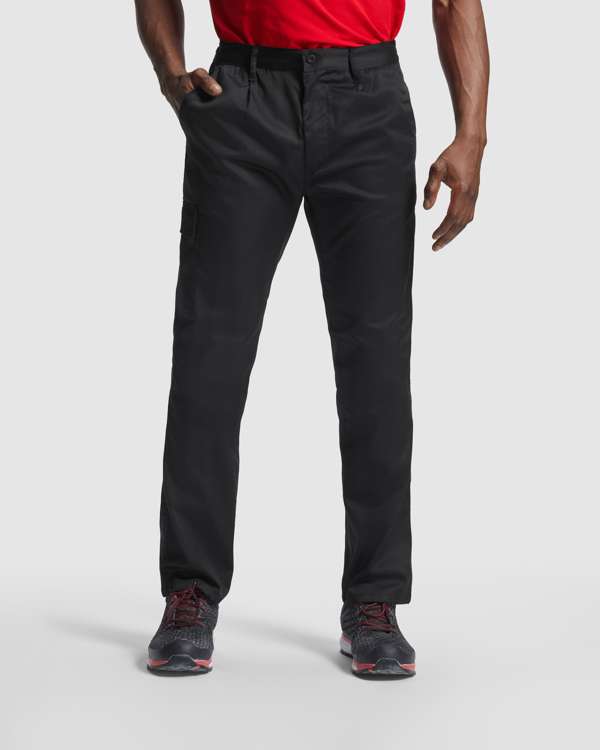 Pantaloni da lavoro lunghi con taglio dritto e tessuto resistente.· Girovita elastico regolabile nella parte posteriore.· Due tasche frontali.· Una tasca posteriore con pattina e chiusura a velcro.· Una stretta tasca laterale sinistra senza pattina.· Una tasca laterale destra con pattina.