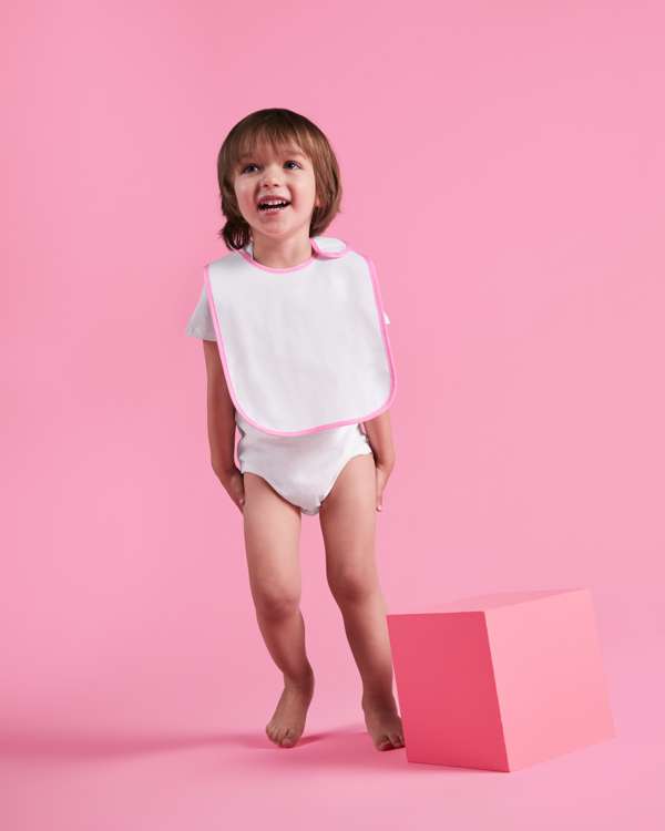Bavaglio orlato. Tessuto di cotone nella parte anteriore e di palstica nella parte posteriore per evitare il trasferimento dei liquidi. Chiusura laterale de velcro morbido.