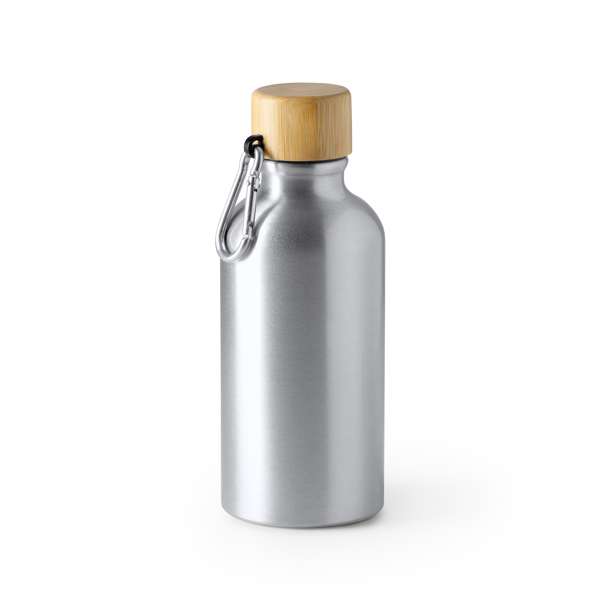 Bottiglia in alluminio con moschettone e coperchio in bambù. Capacità 400 ml.