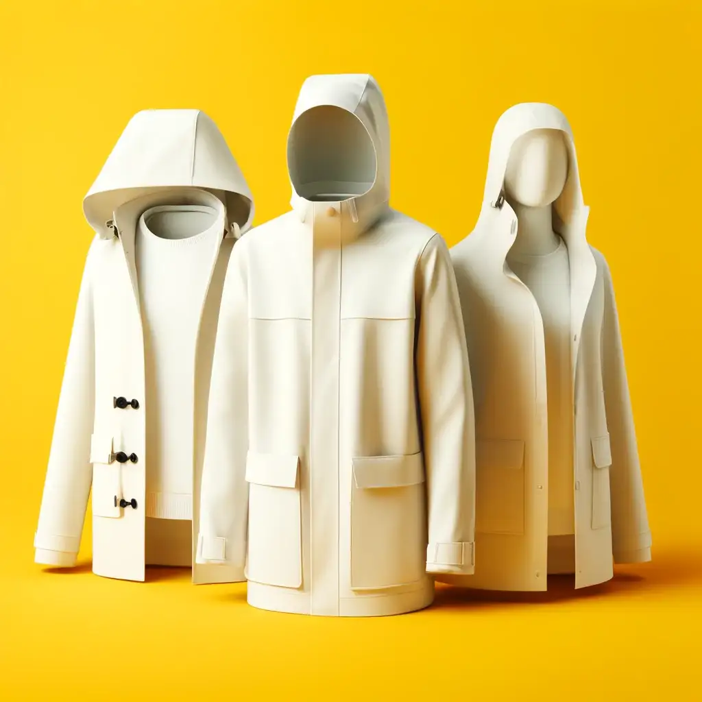 Impermeabile con finiture termosaldate, chiusura centrale con 4 bottoni a pressione, tasche laterali con linguetta, polsini con bottone, 3 spacchetti posteriori e cappuccio regolabile con coulisse.