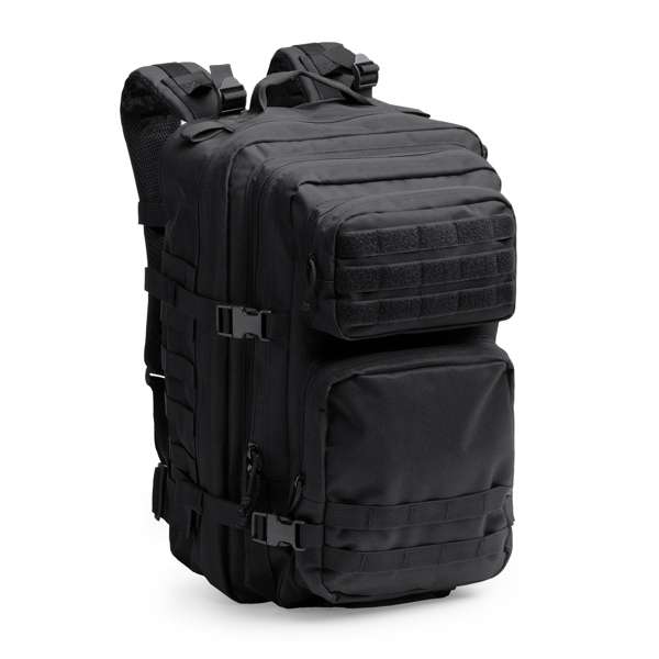 Zaino in stile sportivo realizzato in resistente poliestere 600D. Schienale e spalle imbottiti. Ampia gamma di tasche anteriori e interne. Scomparto principale ad apertura totale con doppia chiusura a strappo e 3 tasche interne. Area frontale con velcro. Regolatori laterali. Tasca antifurto sul retro. Grande capacità di 45 L. Uno zaino completo per qualsiasi attività.