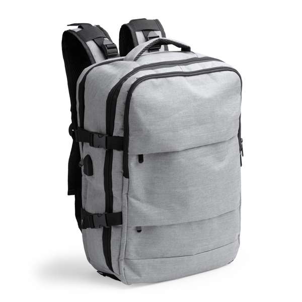 Zaino da viaggio in poliestere riciclato RPET, progettato per garantire comfort e funzionalità. Presenta schienale e maniglie imbottite, 2 tasche frontali esterne e 3 ampi scomparti principali. Include uno scomparto imbottito per laptop da 17,3”, una presa USB con cavo micro USB per collegare un Power Bank (non incluso) e uno scomparto traspirante per le scarpe. Con tasca antifurto sul retro e cinghia per trolley, offre una capacità di 30 litri per viaggi organizzati e sicuri.