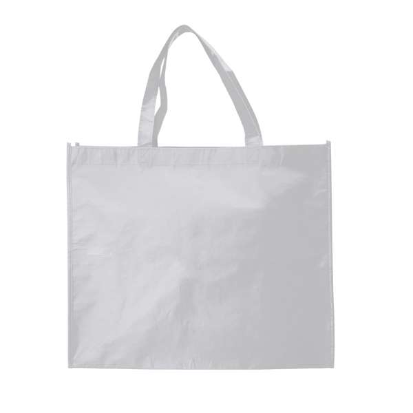 Borsa per la spesa riutilizzabile cucita con finitura in laminato opaco. Realizzata in robusto RPET con manici rinforzati e decorazioni dello stesso colore della borsa.