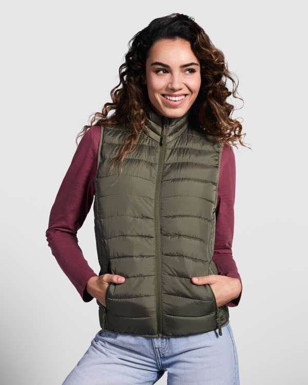 Gilet trapuntato aderente con imbottitura tatto piuma. Cerniere invertite in tinta con protezione per il mento e tirante. Due tasche laterali con cerniera.Orlo elaticizzato su girovita e giromanica.Rivestimento interno a contrasto.Indumento leggero e pieghevole.