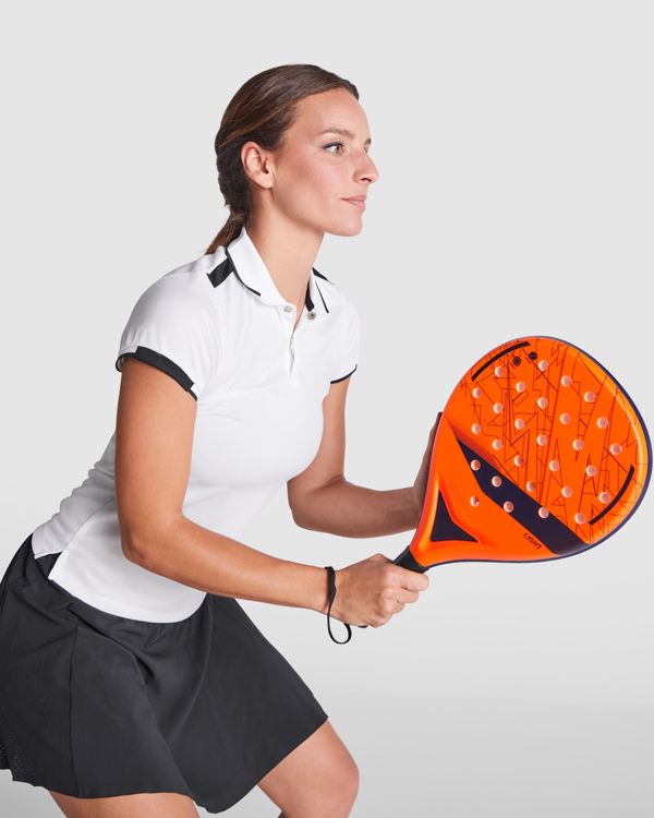 Polo tecnica da donna a manica corta in poliestere riciclato antibatterico. Colletto e manica in costina 1x1. Copri cuciture rinforzate sul colletto. Chiusura con due bottoni a pressione. Spalle e dettagli a contrasto. Spacchi laterali sull'orlo.