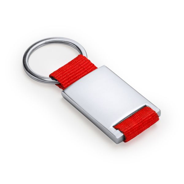 Portachiavi in metallo con cinturino in poliestere colorato.