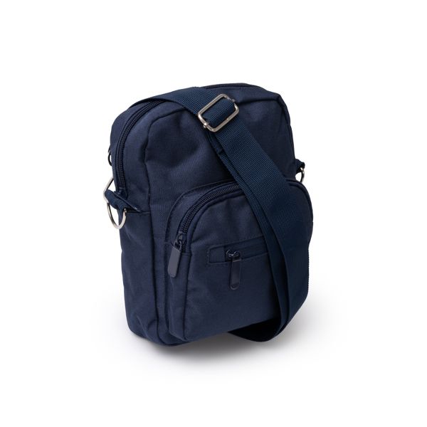 Borsello a tracolla in RPET 600D. Doppia tasca frontale con chiusura a zip e 2 tasche laterali. Manici e schienale imbottiti.
