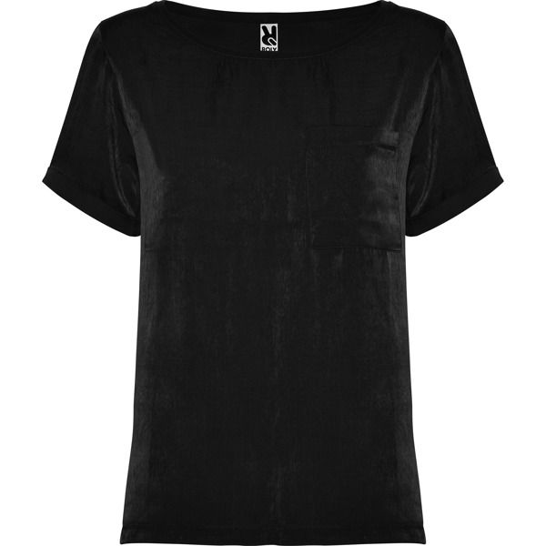 T-shirt da donna maniche corte e ampia scollatura. Tasca sul petto lato sinistro. Parte posteriore leggermente più lunga, con aperture laterali nel girovita.