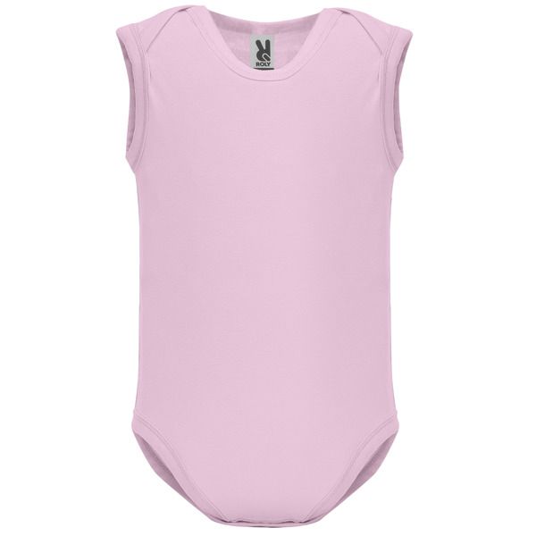 Body neonato con bretelle single jersey. Girocollo, giromanica e parte inferiore rifiniti in costina 1x1. Chiusura con bottone a pressione sull'inguine. Apertura incrociata della spalla.