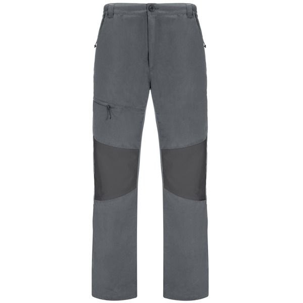 Pantalone da trekking.1. Girovita elastico.2. Tasche frontali con cerniera invertita3. Toppe in contrasto sulle ginocchia, tasca con cerniera invertita sul lato destro.4. Tasca posteriore nel lato destro.