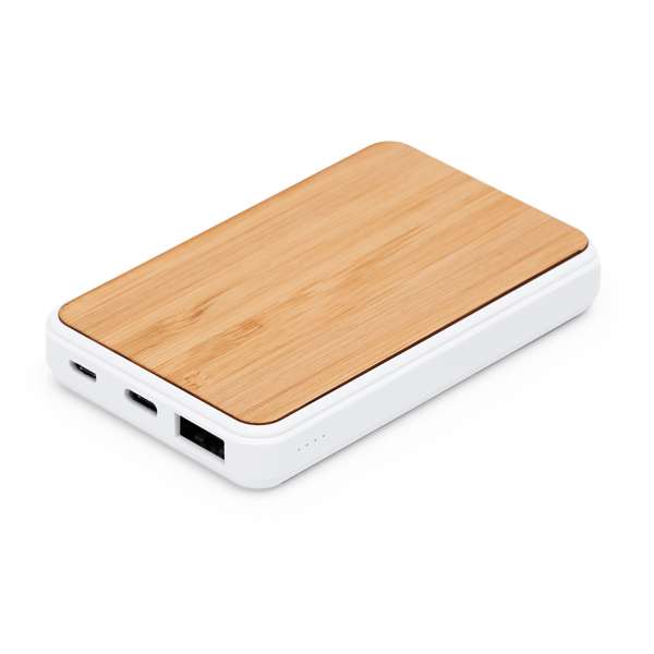 Batteria esterna da 5000 mAh, con corpo rettangolare in ABS bianco e superficie in bambù. Uscita di corrente USB DC5V/2.1A. Include cavo micro USB.
