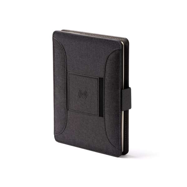 La cartellina multifunzione A5 RPET 300D è un accessorio versatile e pratico che consente di organizzare i documenti. Realizzata in RPET, un materiale riciclato di alta qualità, questa cartellina dimostra il vostro impegno nei confronti dell'ambiente.Grazie alla chiusura magnetica, la cartella assicura che i documenti e gli effetti personali rimangano al sicuro all'interno. Inoltre, è dotata di un caricabatterie wireless integrato nella copertura, che consente di ricaricare comodamente i dispositivi compatibili con la ricarica wireless.All'interno della cartellina troverete un blocco note rimovibile con 56 fogli e uno scomparto per il vostro cellulare, dove potrete tenerlo a portata di mano e protetto. Include anche un portacarte e un portacellulare.La cartellina è dotata anche di un pratico portapenne, per avere sempre una penna a portata di mano quando serve. Inoltre, è incluso un cavo con 3 ingressi (tipo C e uscita USB) che consente di caricare diversi dispositivi e garantisce la compatibilità con vari apparecchi elettronici.