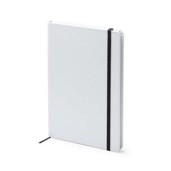 Blocco note in formato A5 ideale per la sublimazione con copertina rigida. Include un segnapagina e un elastico di chiusura abbinato. Contiene 100 fogli di carta comune.