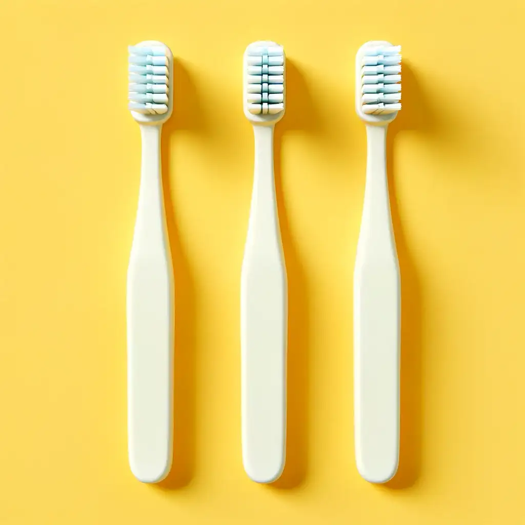 Spazzolino da denti con corpo in PLA. Setole bianche di morbida durezza.