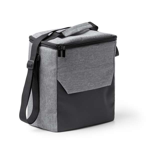Borsa in pelle PU e RPET 300D con interno isotermico. Ampio scomparto principale e tasca esterna con chiusura a zip. Maniglia con rinforzo e tracolla regolabile.
