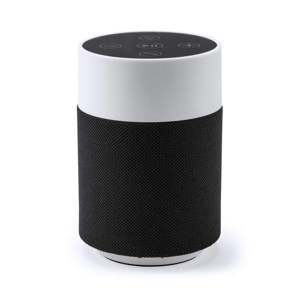 Eccellente cassa wireless Bluetooth 5.0, realizzata con finitura bianca e finitura in gomma. Abbinamento con tessuto colorato. Pannello di controllo touch e luce LED multicolore sulla base, con attivazione casuale a ritmo di musica. Funzione vivavoce. Potenza di 3W e batteria ricaricabile. Cavo incluso.