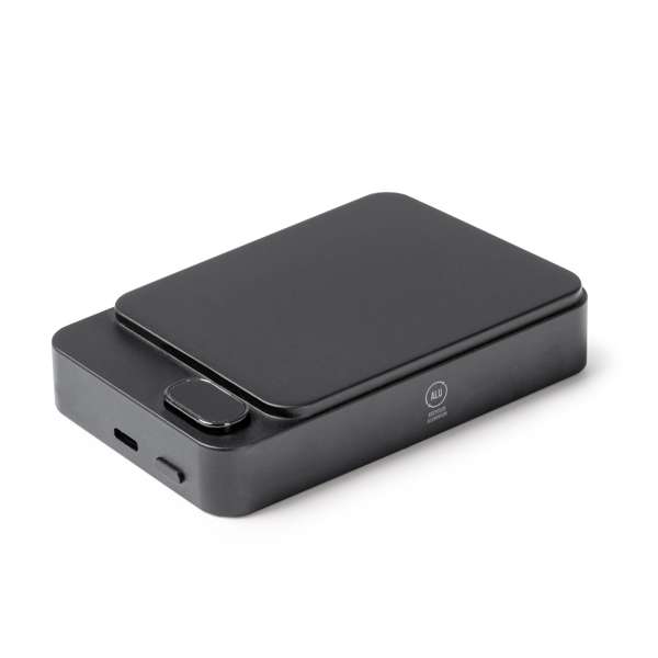 Batteria magnetica esterna da 10000 mAh con funzione di ricarica wireless. Schermata per visualizzare la percentuale di ricarica. Corpo in alluminio riciclato. Corrente d’uscita 15W. Include cavo di tipo C e anello magnetico. Confezione in scatola con design ecologico.