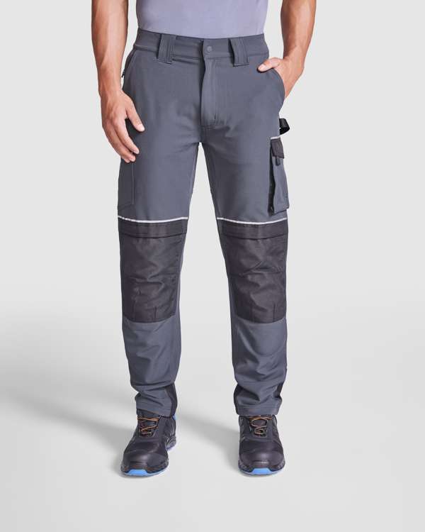 Pantalone da lavoro multitasche elasticizzato.· Cintura in vita con due passanti anteriori e tre posteriori con uno centrale di larghezza speciale.· Chiusura con zip e bottone a pressione gommato.· Due tasche anteriori dal taglio classico, una delle quali con tasca laterale e zip.· Tasca cargo sul lato sinistro con patta, nastro catarinfrangente e chiusura a strappo.· Tasca applicata sul lato destro con nastro catarinfrangente e chiusura a strappo.· Tasca per ginocchiere con patta fissa, nastro catarinfrangente e chiusura a strappo.· Passante per cintura sul lato sinistro per riporre gli utensili.· Carré posteriore con due tasche con profili e zip invertite.· Orlo rinforzato e nastro catarinfrangente sul retro.· Tripla cucitura di rinforzo sul lato e sul cavallo con filo abbinato.· Rinforzo sul retro del cavallo.