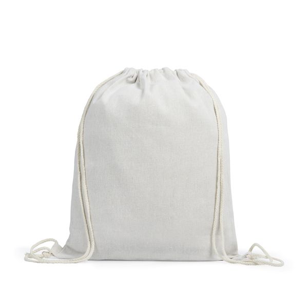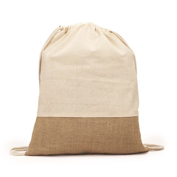 Zaino eco di cotone di 120 g/m² e iuta. Colore naturale. La parte anteriore dello zaino ha una fascia di iuta nella parte inferiore. Lacci cuciti ad entrambi gli angoli inferiori.