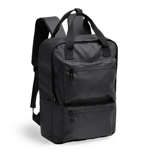 Zaino in pelle PU con uno scomparto principale e tasca interna imbottita per laptop da 17”. Include due tasche esterne con cerniera, una sul davanti e una sul lato. La tasca laterale espandibile è realizzata in poliestere riciclato RPET. È dotata di una cinghia per il fissaggio al trolley, per garantire il comfort durante gli spostamenti. Capacità di 15 litri.